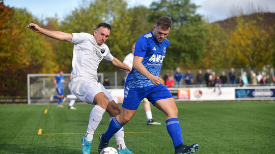 Der Bad Bodendorfer Andre Suckow (links) versucht, dem Heimersheimer Tim Linden den Ball abzuknöpfen - meist gelang das nicht, die SG Landskrone gewann 4:0, hat sich damit in die Top fünf gespielt und will das auch im Heimspiel gegen Kottenheim untermauern. Der SC tritt derweil beim Schlusslicht in Remagen an. Martin Gausmann. Ahr-Foto Martin Gausmann
