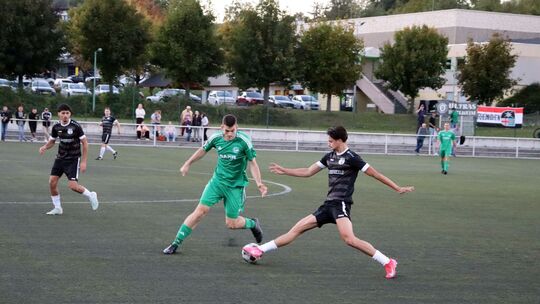 Dahlheims Torschütze Tobias Müller (grünes Trikot) wird in dieser Szene von Horchheims offensivem Mittelfeld-Mann Julius Mandler gestört. Thorsten Stötzer