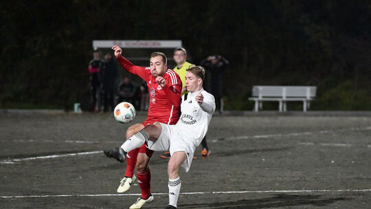 Yannik Ehard (am Ball) brach am Freitagabend in Schönborn mit einem Sonntagsschuss den Bann für Spitzenreiter SG Horressen-Elgendorf. Hier heizt ihm Birlenbachs Lennard Prätorius ein. Andreas Hergenhahn