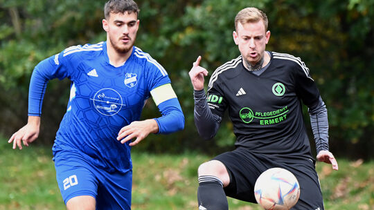 Mittelhofs Top-Torjäger Maurice Michel (in Blau) blieb beim VfB Niederdreisbach (in Schwarz) zwar ohne Tor, dennoch konnte sein Team die zuletzt so starke Defensive des VfB vor gehörige Probleme stellen. Manfred Böhmer/balu