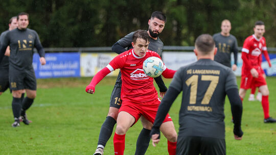 Die SG Langenhahn (dunkle Trikots, in der Mitte Okan Dasbasi) überraschte mit einem Heimsieg gegen die favorisierte SG Herschbach-Schenkelberg (hier Kevin Hörle bei der Ballannahme). Foto: Horst Wengenroth Horst Wengenroth