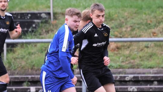 Vor allem in Halbzeit zwei hatte die Bezirksliga-Reserve der SG Maifeld-Elztal (in Blau Daniel Thelen) bei der 0:5-Niederlage in Oberbieber nichts dem heimischen VfL (in Schwarz) entgegenzusetzen. Foto: Jörg Niebergall Jörg Niebergall