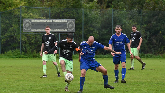 Der SSV Buchholz (in Blau, links der Ex-Karbacher Hendrik Ullrich, der sein Debüt für den SSV feierte, rechts Lino Dörr) führte mit 3:0 und 4:2 gegen den FC Emmelshausen-Karbach III (mit Kapitän Paulo Pinto) und verlor am Ende noch mit 4:5. Mark Dieler