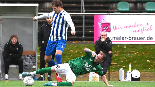 Duell der Spielertrainer: Patrick Kroll (in Blau-Weiß) gewann mit seiner DJK Friesenhagen im Topspiel des 12. Spieltags der Kreisliga B1 gegen Kevin Denter (in Grün) und die SG Betzdorf II. Manfred Böhmer/balu
