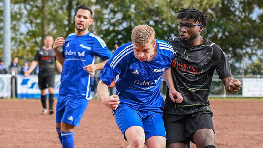 Der SSV Buchholz (in Blau, von links mit Florian Schommers und Christian Schneider) führte mit 1:0 in Damscheid bei der SG Niederburg/Biebernheim/Damscheid II (rechts Osasuwen Victor), verlor am Ende aber mit 1:4. Buchholz belegt damit weiter den ersten Abstiegsplatz zwölf. Niederburg II schoss sich bis auf Rang sechs vor. Foto: Mark Dieler Mark Dieler