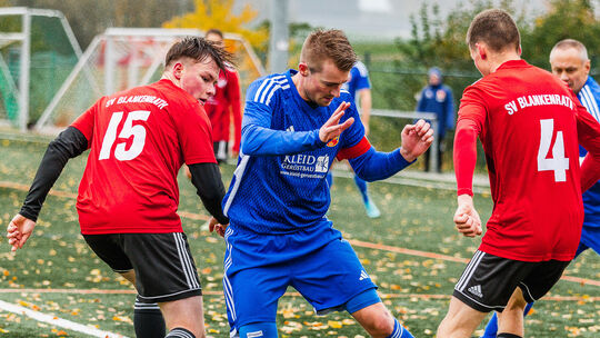 Dominik Krämer (in Blau) brachte seinen TuS Kirchberg III im Kellerduell zwar in Führung, aber am Ende jubelte nur der SV Blankenrath II (von links mit Dimitri Geldt und Luca Ahlert) beim 2:1-Heimsieg. Blankenrath II feierte am letzten Hinrundenspieltag seinen ersten Dreier und reichte damit die Rote Laterne an Lokalrivale FC Peterswald-Löffelscheid weiter. Zwei Mannschaften müssen in der 13-köpfigen B Staffel 11 absteigen. Infrage kommen dafür mit Soonwald, Kirchberg III, Bremm II (alle acht Punkte), Blankenrath II (sechs) und Peterswald (fünf Punkte) nach dem Ende der Hinrunde fünf Mannschaften. Foto: Photo-Moments by Dennis Irmiter Dennis Irmiter