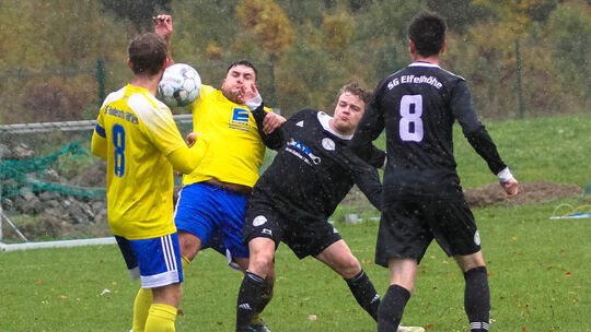 Schon zur Pause war die Partie auf dem trotz der Regenfälle gut zu bespielbaren Rasen in Auderath entschieden gewesen: Gastgeber SG Auderath/Alflen (gelbe Trikots) hatte keine Chance gegen Lokalrivale SG Eifelhöhe. Der Tabellenzweite aus Büchel und Umgebung gewann mit 5:0 (4:0) beim neuen Schlusslicht Auderath. Foto: Alfons Benz Alfons Benz