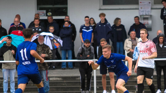 Der SV Ulmen (in Blau, links Phil Weiss, rechts Marius Meurer) hat die SG Ahrtal Hönningen abgehängt und das Spitzenspiel mit 1:0 gewonnen. Ulmen hat als Tabellenführer nun vier Punkte Vorsprung auf Ahrtal Hönningen, jedoch bei einem Spiel mehr. Alfons Benz