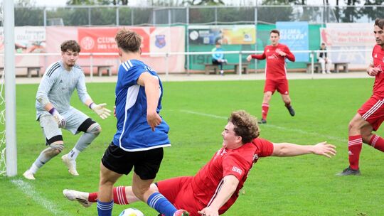 Kampfgeist zeigten die Fußballer des SV Laubach II (in Rot), dennoch verlor das Team um Torwart Robin Zenz (links) mit 0:6 beim TuS Hausen, der am Freitag zum Verfolgerduell bei der FSG Vordereifel Kirchwald antritt. Derweil empfängt Laubach am Sonntag den Vorletzten SG Weiler. Jörg Niebergall