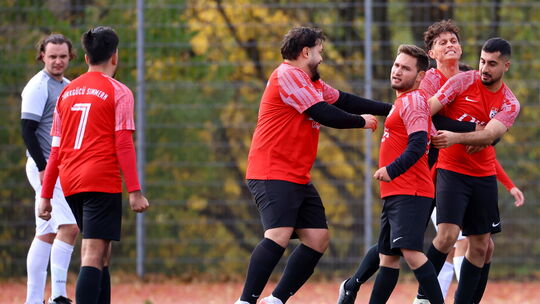 Jubel bei Türkgücü Simmern nach dem 2:1-Siegtor in der Nachspielzeit gegen Stadtrivale SG Soonwald/Simmern um Kapitän Moritz Piroth (links). B&P Schmitt