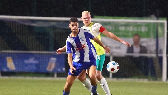 Wirges-Akteur Ronaldo Kröber (blau-weißes Trikot, hier im Duell mit Mülheim-Kärlichs Kapitän Christoph Fritsch) war beim 4:0-Sieg seiner Mannschaft gegen die SG 2000 ohne Frage der Spieler des Spiels, er trug sich gleich dreimal in die Torschützenliste ein. René Weiss