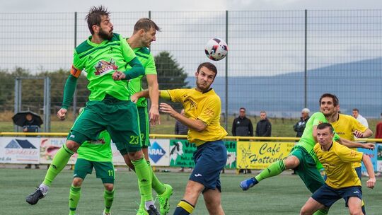 Am Ende waren die Mendiger (grüne Trikots) obenauf: Florian Schlich, Florian Wirths und Kodai Stalph (von links) schockten die Kirchberger um Tim Reifenschneider und Jonas Heimer mit späten Toren. Foto: hjs-Foto Hermann-Josef Stoffel