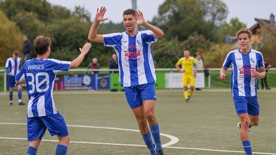 Hat die Spvgg EGC Wirges um (von links Marcel Ring, Ronaldo Kroeber und Euan Williams-Noss) auch in Wittlich wieder Grund zum Jubeln? Zuletzt gewann die Mannschaft von Sven Baldus dreimal in Folge, sieht sich aber beim Aufstiegsmitfavoriten nur in der Außenseiterrolle. Horst Wengenroth. Photo: (c) Horst Wengenroth 2025