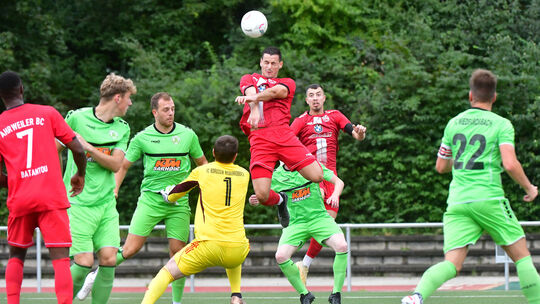 In der Fußball-Rheinlandliga eine Nummer für sich: Mit fünf Toren Vorsprung führt Almir Porca (beim Kopfball) vom Ahrweiler BC die Torjägerliste an, der ABC-Stürmer traf 25 Mal, zwei davon gelangen ihm beim 6:2-Heimsieg gegen den FC HWW Niederroßbach (in Grün und Gelb) – für die Mannschaft des Oberligaabsteigers lief es zwar auch ganz gut, aber vor allem der Jahresabschluss mit zwei Niederlagen fuchste den ABC. Foto: Vollrath Martin Gausmann. Vollrath