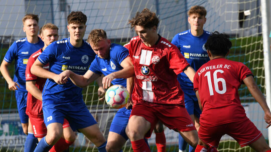 In dieser Szene des Heimspiels gegen Ahrweiler (in Rot) hat der VfB Wissen mit (von links) Max Krauß, Paul Christian, Philipp Weber und Luca Kirschbaum genügend Spieler hinter dem Ball, den Schlussmann Philipp Klappert in zwei anderen Situationen aber doch aus dem Netz holen musste. Foto: balu balu