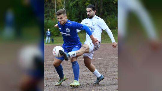 Die Hartplatz-Saison ist eröffnet: Zwar brauchten Justin Kirschbaum (in Blau) und seine VfB-Kollegen die erste Halbzeit, um sich an den matschigen Untergrund zu gewöhnen. Doch danach drückten die Wissener dem Heimspiel gegen die EGC Wirges (in Weiß Berkan Yavuz) den Stempel auf. Foto: balu balu