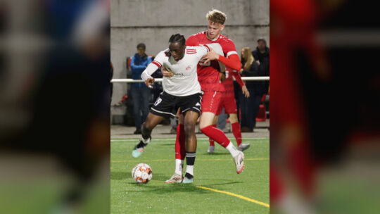 Zurück nach Gelb-Rot-Sperre: Immendorfs Innenverteidiger Lukas Claus (in Rot) darf gegen Ahrweiler wieder ganz eng am Mann sein wie hier beim 3:1 gegen Rübenach mit Hamza Aliou - und zwar in der Partie, in der er nach 73 Minuten vom Feld musste. Jörg Niebergall