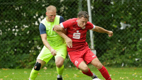 Viele enge Zweikämpfe wie hier zwischen Immendorfs Alec Webel (in Rot) und Bitburgs Pascal Alff gab es auf dem Arenberger Ausweichrasen zu sehen, Tore allerdings nicht, die Partie endete 0:0. Wolfgang Heil