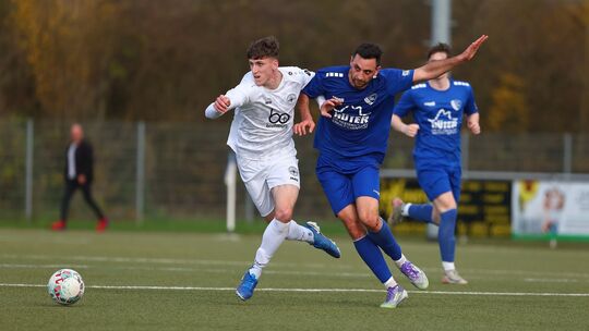 Der aus Oberwinter nach Andernach gekommende Tim Esten (in Weiß) entwischt hier dem Wirgeser Samet Sögünmez. Esten traf nach 66 Minuten zum 2:0-Endstand, es war sein achter Saisontreffer. René Weiss