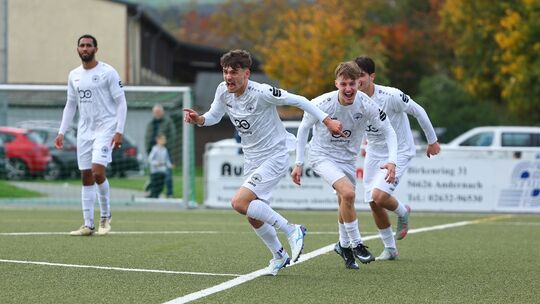 Leon Schmitz (Zweiter von links) dreht jubelnd ab: Der 19-jährige Andernacher Innenverteidiger hat soeben das späte 2:2 für die Gastgeber gegen die SG Schneifel erzielt. René Weiss