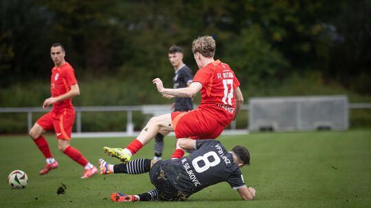 Nein, mangelnden Einsatz konnten sich Meris Siljkovic (schwarzes Trikot) und sein VfB Linz beim Gastspiel in Bitburg nicht vorwerfen lassen. Am Ende standen ein 0:0 und ein zumindest mit der Leistung zufriedener Trainer Thomas Schuster. Maximilian Jäger