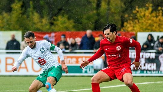 Daniel Aretz (weiß-grünes Trikot), der dieses Mal die Kapitänsbinde des verletzten Christoph Fritsch übernommen hatte, und seine SG 2000 Mülheim-Kärlich hielten bei Spitzenreiter SV Rot-Weiss Wittlich (hier mit Alexander Klein) 45 Minuten lang gut mit. Das reichte aber nicht. Am Ende standen eine deutliche 1:4-Niederlage und das Abrutschen auf Tabellenplatz vier. Sascha Wetzlar