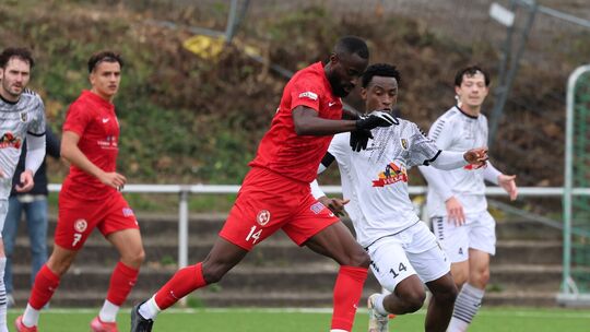 Vierzehner unter sich: Wittlichs Christopher Bibaku (in Rot) will hier an Mendigs Dama Kanoute vorbeiziehen, der Wittlicher Offensivmann traf fast mit dem Halbzeitpfiff zum 1:0, es war sein sechster Saisontreffer. Die Gäste siegten am Ende knapp mit 2:1 beim Aufsteiger. Jörg Niebergall