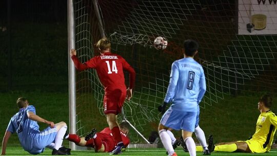 Diesem Tor von Niederroßbachs Alexander Gombert (links am Boden) liefen die Eisbachtaler Sportfreunde am Dienstagabend vergebens hinterher. In der Endphase kassierte der Oberliga-Absteiger noch Gegentreffer Nummer zwei, der das Aus in der dritten Pokalrunde besiegelte. Foto: René Weiss René Weiss
