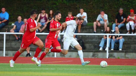 Thomas Idel (Mitte, rotes Trikot) wird dem Ahrweiler BC am Wochenende beim letzten Spiel des Jahres in Andernach fehlen. Er hatte beim 2:1 gegen Wissen Gelb-Rot gesehen. Ein Vorteil für Daniel Herbst (weißes Trikot) und seine SG 99? René Weiss