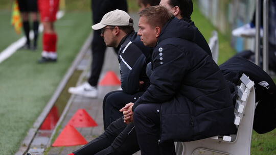 Immendorfs Co-Trainer Julian Schmitz (vorne) vertrat seinen "Chef" Marvin Schenk (mit Kappe) im Spiel bei der SG Arzfeld - und musste ihm von einer 0:1-Niederlage berichten. Horst Wengenroth. Photo: (c) Horst Wengenroth 2025