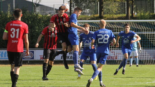 Nach dem Heimspiel gegen die SG Schneifel (Foto, 0:3) und dem Derby bei den Eisbachtaler Sportfreunden (2:5) steht für die Spvgg EGC Wirges (blaue Trikots) das Duell mit dem dritten Topteam der Rheinlandliga an, wenn am Sonntag der Ahrweiler BC ins Theodor-Heuss-Stadion kommt. Foto: Marco Rosbach Marco Rosbach