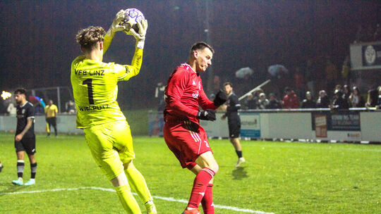 Der Linzer Torwart Tyron Wielpütz (in Gelb) war nicht zu bezwingen, Lars Oster (rechts) versuchte es viermal, viermal hieß der Sieger Wielpütz. Alfons Benz
