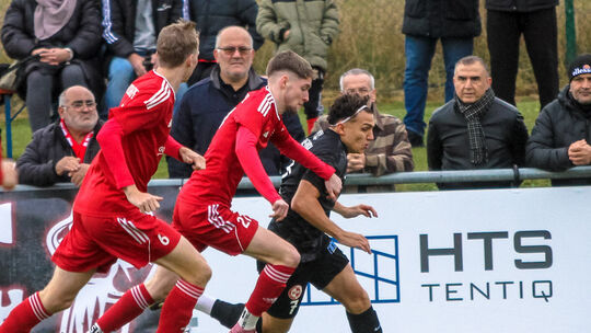 Der Wittlicher Mohammad Rashidi (in Schwarz) war nicht immer zu halten für die Laubacher (von links mit Paul-Jordan Michels und Marco Krenn), Rashidi traf beim 3:1 doppelt und besorgte die wichtigen ersten beiden Treffer für das Top-Team, das mit Ahrweiler punktgleich die Rheinlandliga anführt. Laubach bleibt mit zehn Punkten Drittletzter. Alfons Benz