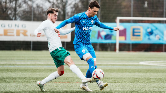 Erfolgreiches Debüt: Ex-Profi Christopher Theisen (in Blau), der 64 Mal in der 3. Liga für Fortuna Köln und Viktoria Köln spielte, hat sich nach einem halben Jahr Pause im Winter dem Oberligisten FC Emmelshausen-Karbach angeschlossen. In seinem ersten Auftritt für den FCEK markierte der 32-jährige Theisen direkt den Treffer zum 2:1-Halbzeitstand beim 5:2 in Rübenach gegen den Rheinlandligisten Mülheim-Kärlich. Matthias Bernd