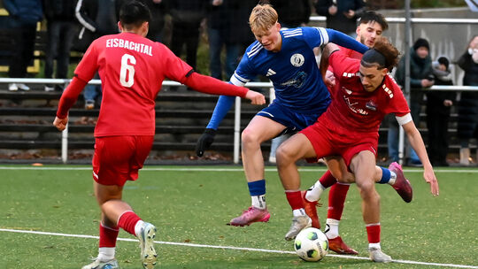 Der Schein trügt: So energisch wie in dieser Szene konnten sich die Spfr Eisbachtal um Kapitän Can Malik Peacock (am Ball) gegen die Spieler des JFV Wolfstein Ww/Sieg (in Blau Sam Dustin Bimber) nur selten durchsetzen. Die Oberwesterwälder behielten in der 4. Runde des Rheinlandpokals klar die Oberhand (6:2). Manfred Böhmer/balu