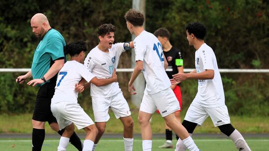 Ordentlich Grund zu Jubeln: Die B-Junioren der JSG Neuwied (in Weiß) schlugen den JFV Bitburg mit 5:0 und freuen sich hier über das zwischenzeitliche 2:0 durchs Kapitän Abdulawahab Haj Amin. Jörg Niebergall