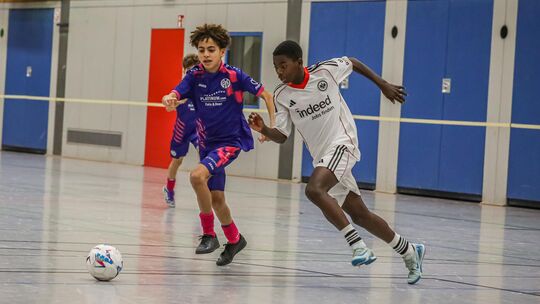 Der Nachwuchs von Eintracht Frankfurt (rechts, hier im Duell mit dem 1. FSV Mainz 05) gewann ohne Niederlage das U12-Turnier beim Eisbachtaler Budenzauber in Montabaur. Andreas Egenolf