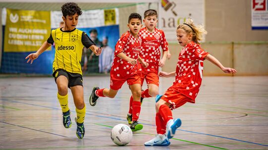 Auf viele intensive Zweikämpfe können sich die Zuschauer beim dritten Eisbachtaler Budenzauber am 10. und 11. Januar 2026 freuen, wie hier im Vorjahr zwischen Borussia Dortmund und Mainz 05. Andreas Egenolf
