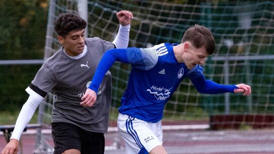 Hier hielt sich Cochems Maris Tullius (in Blau-Weiß) im Spiel gegen die neue JSG Hunsrück-Mittelrhein den Gäste-Stürmer Mohamad Alhaj zwar vom Leib, immer gelang das aber nicht, denn Alhaj war der entscheidende Spieler traf beim 3:2 der Gäste in der A-Junioren-Bezirksliga Mitte dreimal. Foto: Sascha Berkele Sascha Berkele