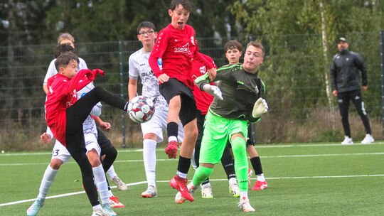 Der Tabellenvorletzte JFV Schieferland (in Rot) um Torwart Leon Schweyen wehrte sich in der C-Jugend-Rheinlandliga bei schwierigen Witterungsverhältnissen in Müllenbach stark gegen den Tabellenführer FC Metternich und musste sich am Ende nur mit 1:2 geschlagen geben. Alfons Benz