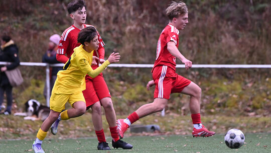 Die C-Junioren des JFV Wolfstein (rote Trikots) und der jüngere Jahrgang der TuS Koblenz trennten sich in Daaden leistungsgerecht mit 1:1. Manfred Böhmer/balu
