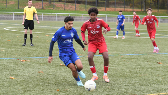Leonel Asfaha (vorne in Rot) gelang im vergangenen Heimspiel der zwischenzeitliche Ausgleich zum 1:1. Am Ende unterlag die Eisbachtaler A-Jugend dem SV Viktoria Herxheim aber mit 1:6. Wird's in Gau-Odernheim besser? Andreas Hergenhahn