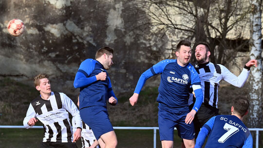 Mit dem 4:1 gegen den SC Saffig (in Blau) hat die SG Kempenich (links Christoph Kimmich, rechts Nico Degen) wichtige Punkte im Abstiegskampf gesammelt. Nun sollen bei Schlusslicht Miesenheim weitere herausspringen. Foto: Vollrath