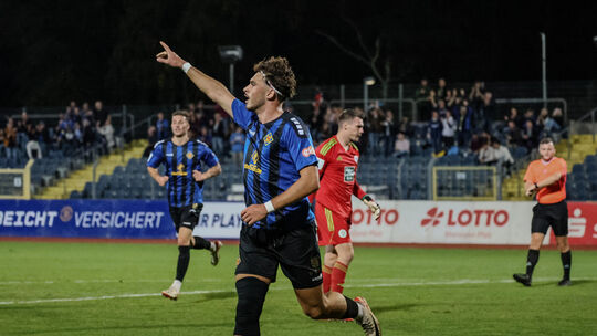 Erijon Shaqiri jubelt: Der TuS-Angreifer brachte die Gastgeber in der zwölften Minute mit 1:0 in Führung. Foto: Heinz-Jörg Wurzbacher Heinz-Joerg Wurzbacher