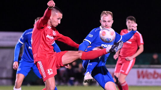 Viel Kampf und guter Fußball: Die SG Mudersbach/Brachbach (in Blau) gewann mit 3:1 beim ungeschlagenen Spitzenreiter Rot-Weiß Hünsborn (in Rot). Manfred Böhmer/balu