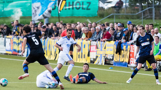 Beim Oberligaderby in Emmelshausen vor toller Kulisse hatten die Fußballer der TuS Koblenz (blau-schwarze Trikots) alles im Griff und setzten sich gegen den TSV mit 2:0 durch. Foto: hjs-Foto Stoffel