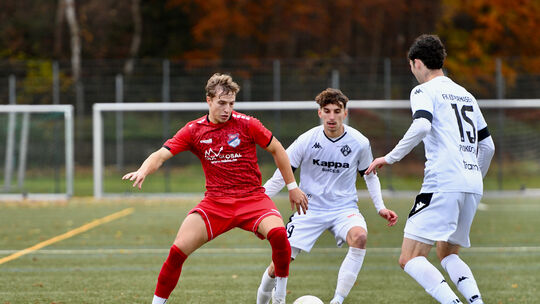 Torschützen unter sich: Für Eisbachtal traf Finn Müller zum wichtigen 1:2 in der Nachspielzeit der ersten Hälfte, Oskar Prokopchuk (rechts) hatte den Spitzenreiter Pirmasens mit einem Doppelpack 2:0 in Führung gebracht, musste aber mit seinem Kollegen Silas Gutmann auch noch das 2:2 der Gastgeber durch Jonah Arnolds hinnehmen. Andreas Hergenhahn