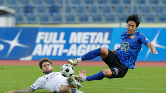 Bei der TuS hebt nach dem 4:1 gegen Dudenhofen keiner ab, außer vielleicht Masahiro Fujiwara (in Blau-Schwarz) in dieser Szene vom siegreichen Heimspiel auf dem Oberwerth gegen den Aufsteiger. Wolfgang Heil