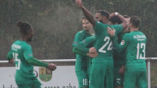 Jubel im Waldalgesheimer Dauerregen: Die Alemannia freut sich über den zweiten Treffer von Pierre Merkel (Nummer 24). Eugene Dennis (links) kommt angelaufen und will mitfeiern. Foto: Matthias Schlenger Matthias Schlenger