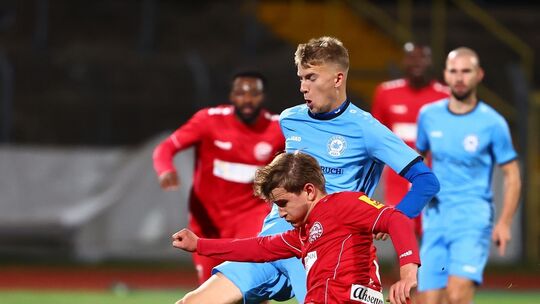 Keine Zeit zum Durchatmen: Connor Klossek (vorne in Rot) muss mit dem FC Rot-Weiss bereits am Samstag wieder auf dem Oberwerther Rasen spielen. Ben Heuser (vorne in Blau) kann mit dem FC Cosmos einen Tag länger regenerieren. Foto: René Weiss René Weiss